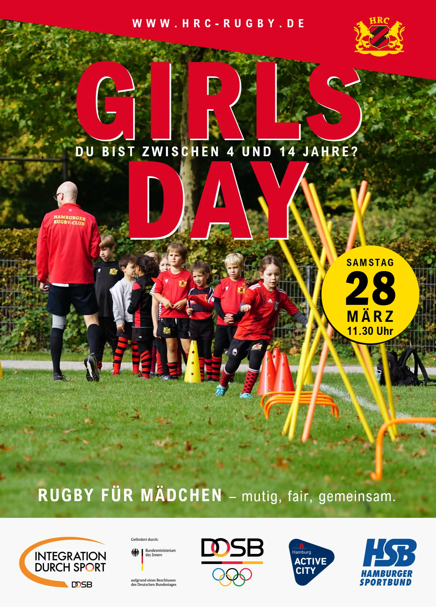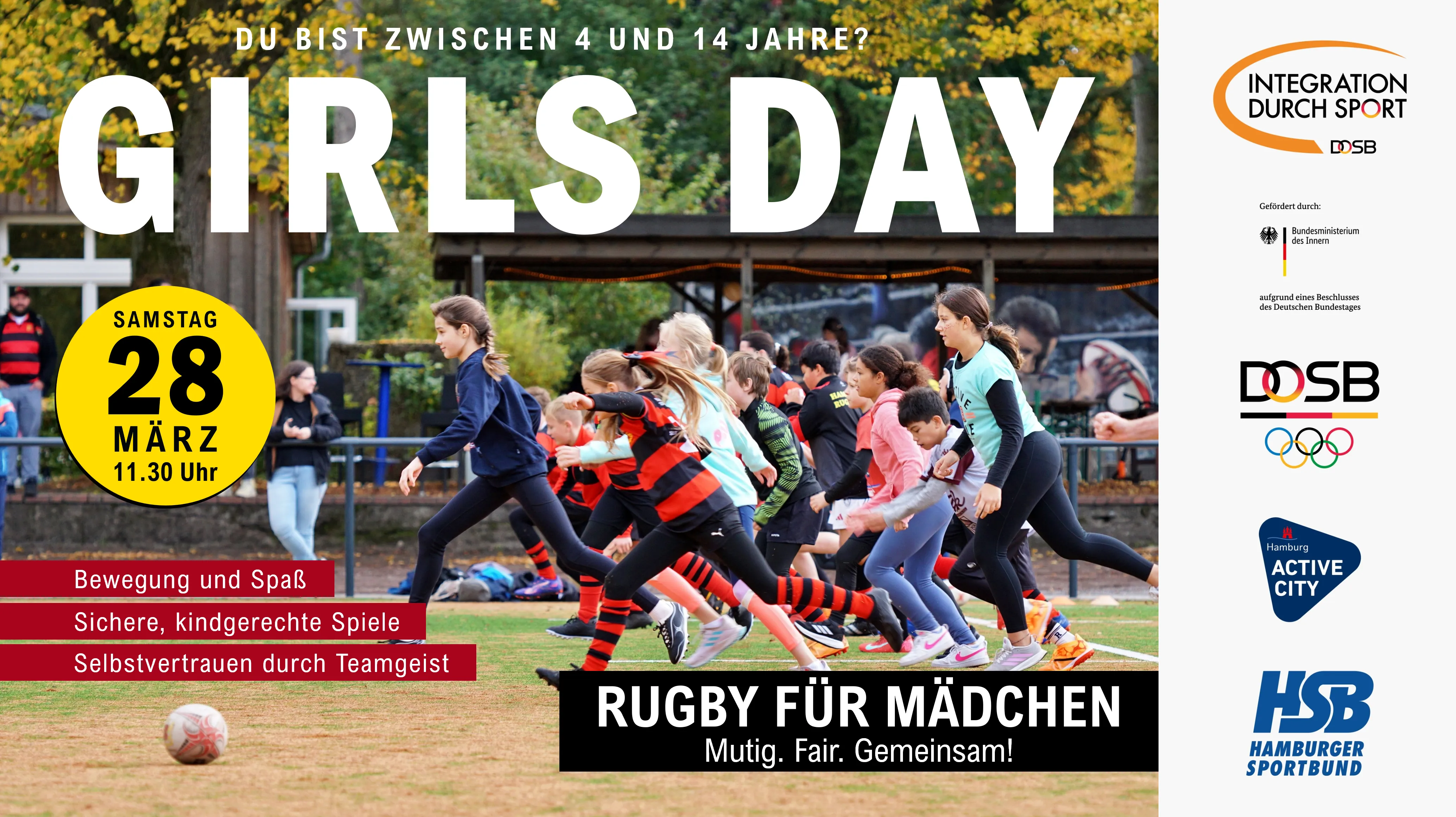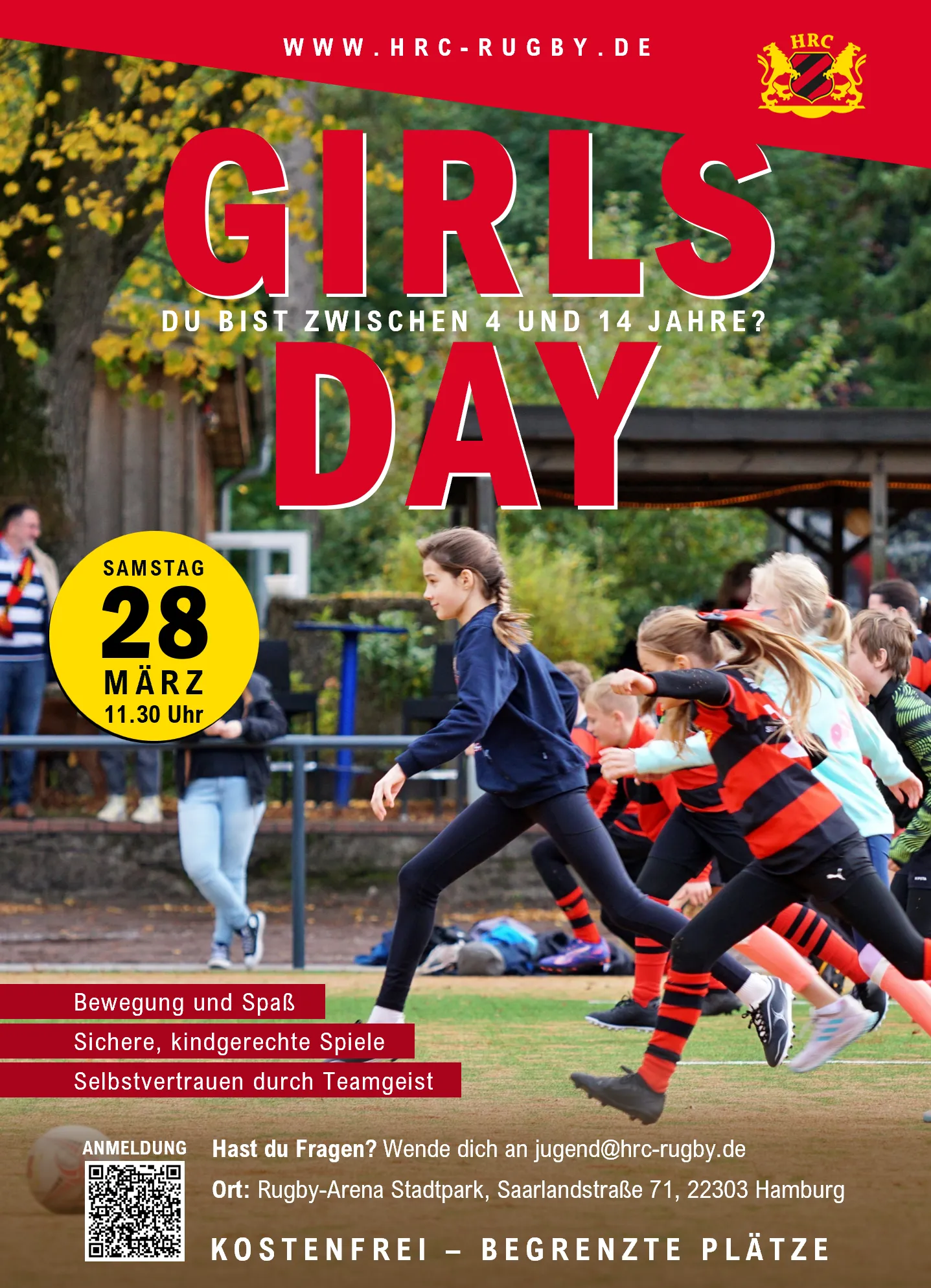Am Samstag, den 28. März 2026, lädt der Hamburger Rugby-Club von 1950 e.V. Mädchen im Alter von 4 bis 14 Jahren zu einem besonderen Aktionstag in die Rugby-Arena im Stadtpark ein. Beim „Girls Day“ können Kinder und Jugendliche Rugby ganz unkompliziert ausprobieren – ohne Vorkenntnisse, ohne Leistungsdruck, dafür mit viel Spaß, Bewegung und echtem Teamgefühl. Unter freiem Himmel und in geschütztem Rahmen entdecken die Teilnehmerinnen, wie viel Freude es macht, gemeinsam zu rennen, zu passen und als Team zusammenzuhalten. Rugby ist hier weniger „hart“, sondern vor allem fair, inklusiv und stärkend – besonders für Mädchen, die Lust auf etwas Neues haben. Ein sportliches Teamerlebnis für Mädchen In einer 90-minütigen Trainingseinheit lernen die Mädchen: • grundlegende Rugby-Bewegungen und Balltechnik • spielerische Übungen für Schnelligkeit, Koordination und Kraft • einfache Spielformen, bei denen Teamgeist, Fairness und Mut im Mittelpunkt stehen Gespielt wird in altersgerechten Gruppen mit kindgerechten Regeln – ohne hartes Vollkontakt-Tackling. Erfahrene Trainer*innen des HRC leiten das Training an, achten auf Sicherheit und holen auch zurückhaltende Kinder behutsam ins Spiel. So können alle in ihrem eigenen Tempo ausprobieren, was in ihnen steckt. Zum Abschluss wartet ein besonderes Highlight: Interessierte Mädchen können beim anschließenden Heimspiel der 1. Herrenmannschaft des HRC als Einlaufkinder mit auf den Platz laufen und direkt am Spielfeldrand Bundesliga-Luft schnuppern – ein echtes Gänsehaut-Erlebnis. Eventdetails Datum: Samstag, 28. März 2026 Uhrzeit: 11:30 – 13:00 Uhr Ort: Rugby-Arena Stadtpark, Saarlandstraße 71, 22303 Hamburg-Winterhude Veranstaltungsart: Aktionstag für Mädchen, Schnuppertraining Rugby Zielgruppe: Mädchen von 4 bis 14 Jahren (Grundschule bis frühes Teenageralter) Teilnahme: kostenfrei Hinweis: Die Plätze sind begrenzt und werden in der Reihenfolge der Anmeldungen vergeben. Mitbringen • sportliche Kleidung und Sportschuhe (je nach Wetter ggf. Regenjacke) • gefüllte Trinkflasche • ggf. Wechselkleidung Über den Girls Day & Förderung Der Girls Day richtet sich an Mädchen, die eine neue Teamsportart kennenlernen, sich ausprobieren und gemeinsam stark werden möchten – unabhängig von sportlicher Vorerfahrung. Der Aktionstag wird im Rahmen des Programms „Integration durch Sport“ des DOSB gefördert und durch den Hamburger Sportbund sowie die Initiative Hamburg Active City unterstützt. Fazit Der Girls Day beim Hamburger Rugby-Club bietet Mädchen in Hamburg die Chance, Rugby in sicherer und fröhlicher Atmosphäre auszuprobieren – mit viel Bewegung, Teamgeist und starken Vorbildern am Spielfeldrand. Wer ein unverbindliches, kostenfreies Sporterlebnis im Stadtpark sucht, sollte sich frühzeitig anmelden – die Plätze sind begrenzt.